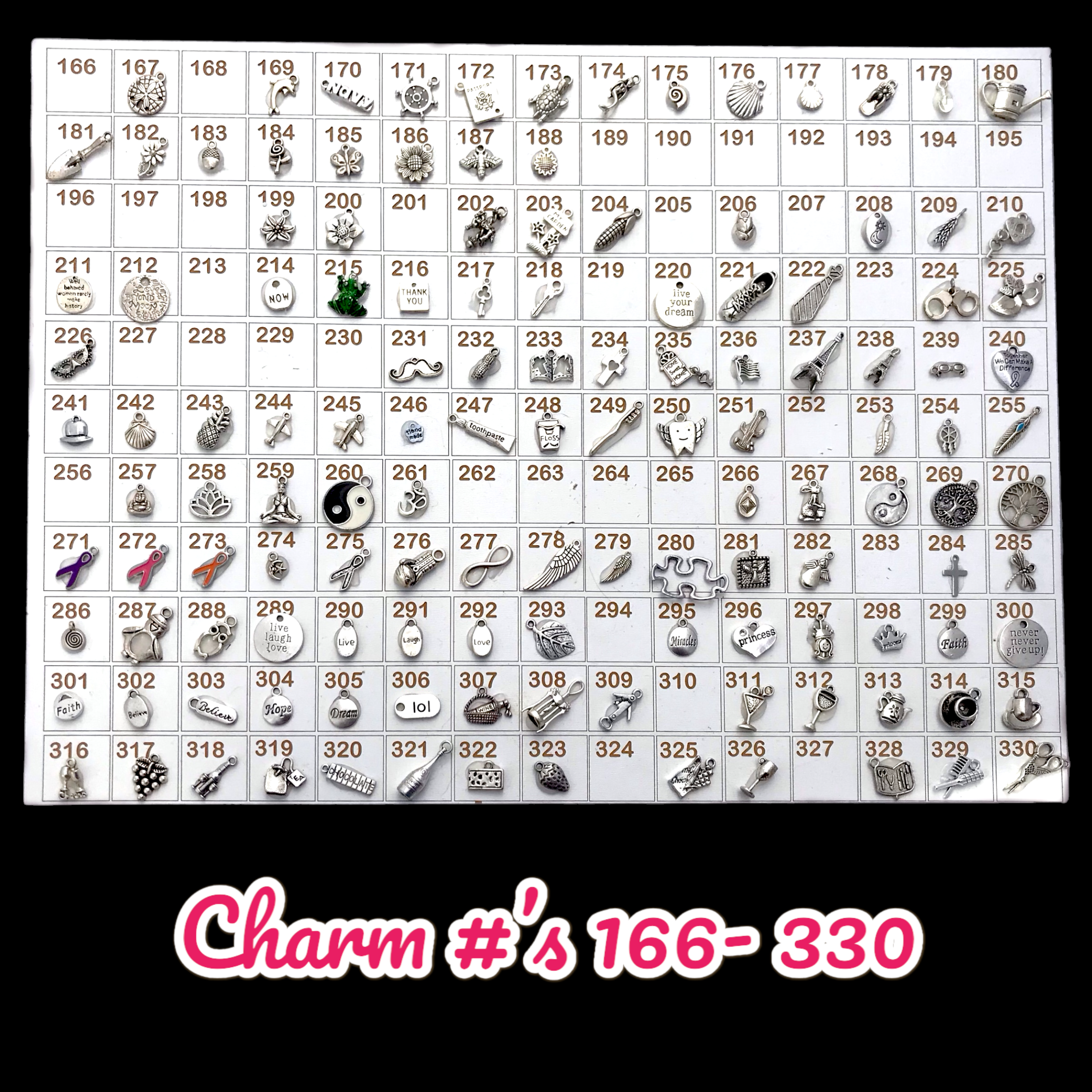 Use this master charm chart to select charms that interest you. Whether you are a cat or a dog lover, to a sports fan and a coffee lover, you will find majority of subjects.